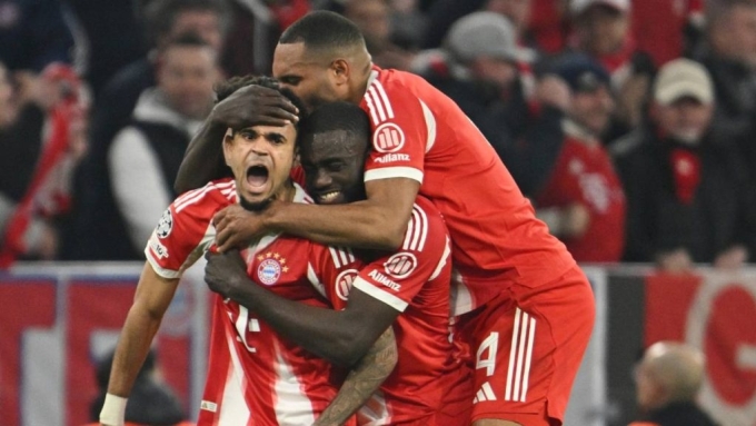 Đồng đội chia vui với Diaz (trái) trong trận Bayern Munich thắng Real Madrid 4-3 ở lượt về tứ kết Champions League trên sân Allianz Arena,Đức ngày 15/4/2026. Ảnh: UEFA