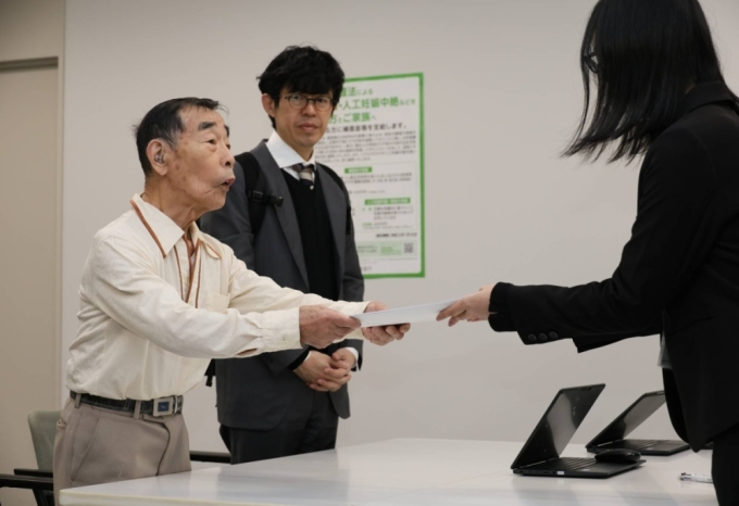 Một nạn nhân (áo trắng) nộp đơn yêu cầu bồi thường cho việc triệt sản cưỡng bức,hôm 17/1 tại Tòa nhà Chính quyền Thủ đô Tokyo. Ảnh: Japan Times