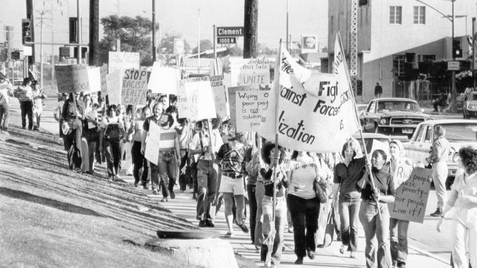 Những người biểu tình bên ngoài Trung tâm Y tế quận Los Angeles vào năm 1974 phản đối việc triệt sản cưỡng bức theo thuyết ưu sinh. Ảnh: LA Times