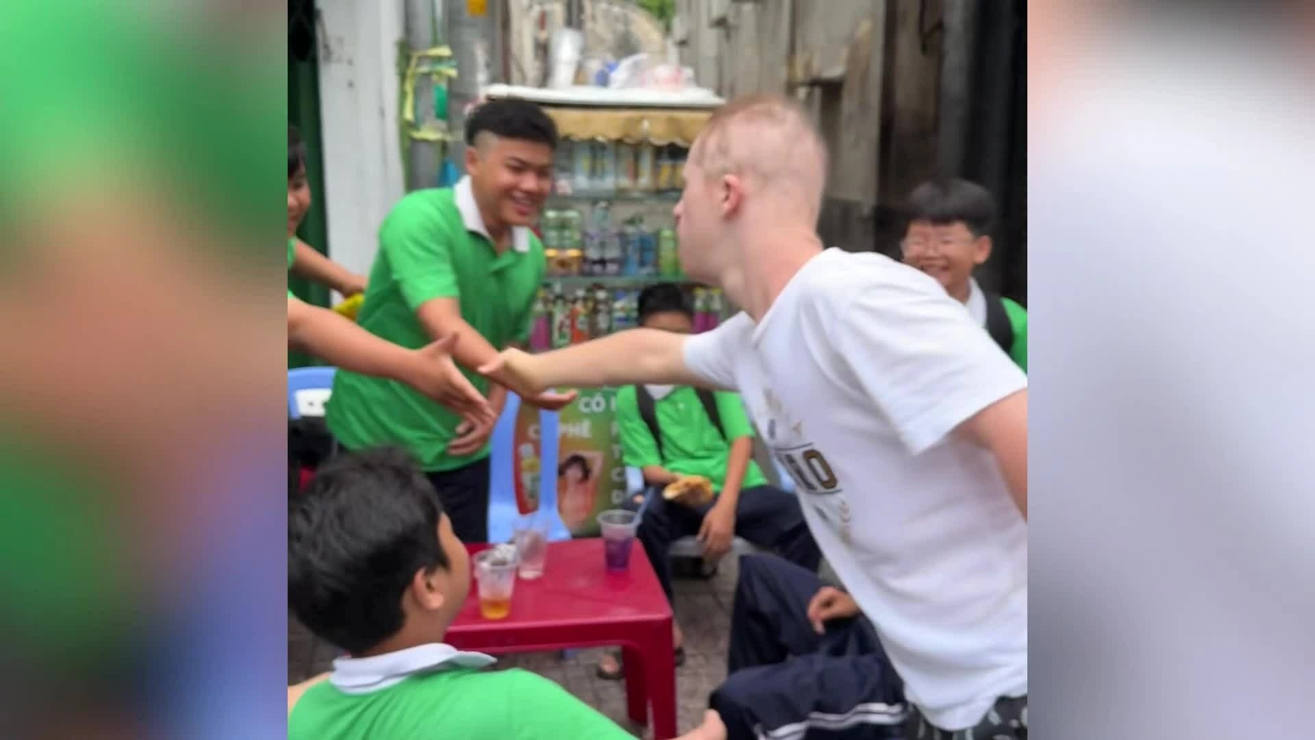 Đoạn video dài chưa đầy một phút ghi lại cảnh Joey,chàng trai 26 tuổi người Australia,ngượng ngùng đập tay (high-five) rồi được một nhóm học sinh tiểu học tại TP HCM vui vẻ vẫy tay chào đón,thậm chí ôm hôn đã thu hút hơn 2 triệu lượt xem trên mạng xã hội.