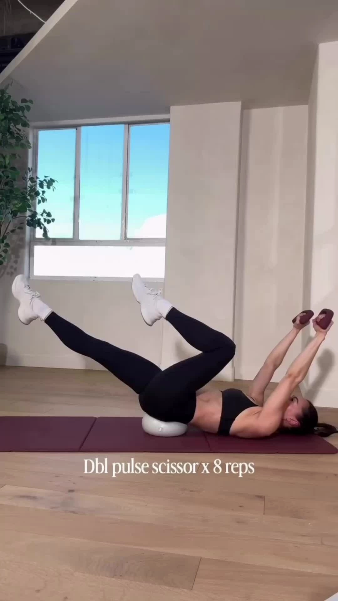 Cầm một quả bóng yoga,chuyền nó qua dưới chân đang giơ cao trong khi gập bụng. Sau đó đổi vị trí,hạ chân trên xuống và đưa bóng qua đầu.