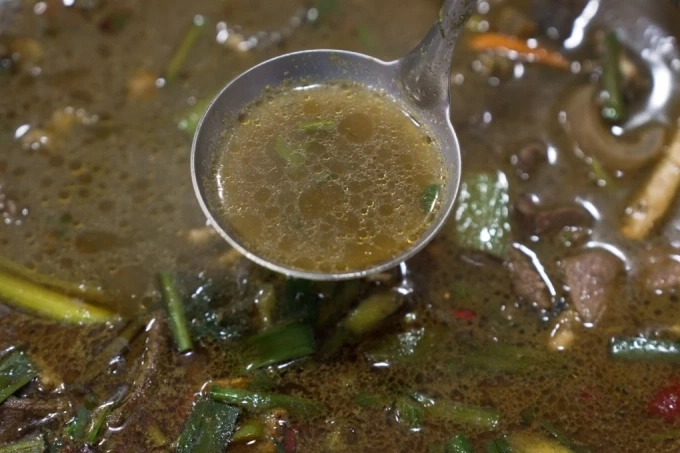 Quy trình chế biến bắt đầu bằng phi thơm tỏi,gừng,hành lá và ớt Quý Châu. Thịt bò cùng nội tạng được xào sơ trước khi đổ hỗn hợp dịch cỏ và mật bò vào đun sôi. Nước dùng của món lẩu có màu xanh ô liu đậm.