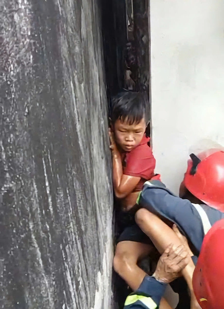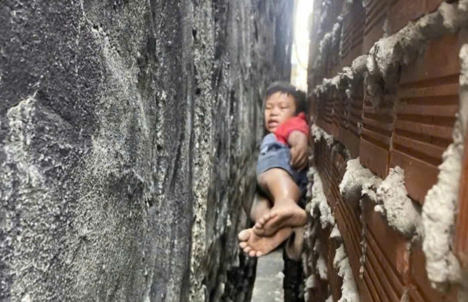 Bé trai kẹt giữa hai bức tường. Ảnh: Thái Hà